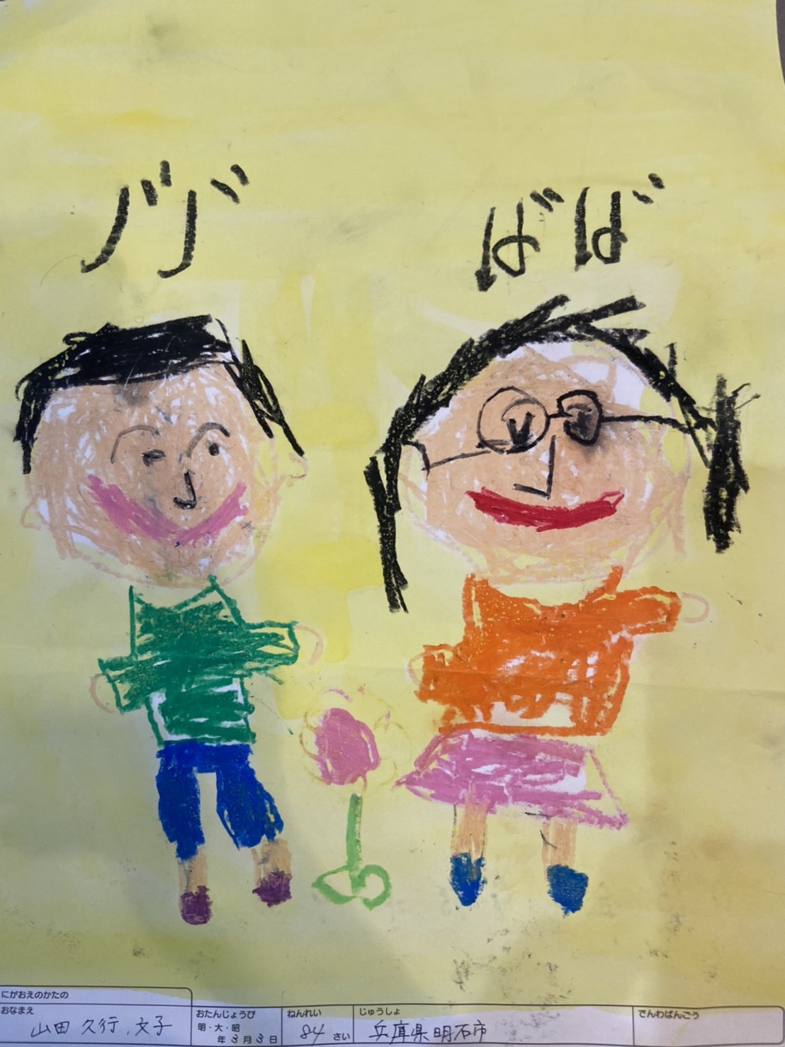 昨年の敬老の日に書いた絵が、保育園から戻ってきたそうです。私かな~と喜んでいたら、兵庫に住む孫にとっては、ひいじぃちゃんとひいばぁちゃんだそうです。実家の両親を思ってくれる優しい孫に嬉しい気持ちですが…私たちの絵じゃない事にちょっと複雑な心境です(笑)でも、上手でしょ?特に父はそっくりです(^^)