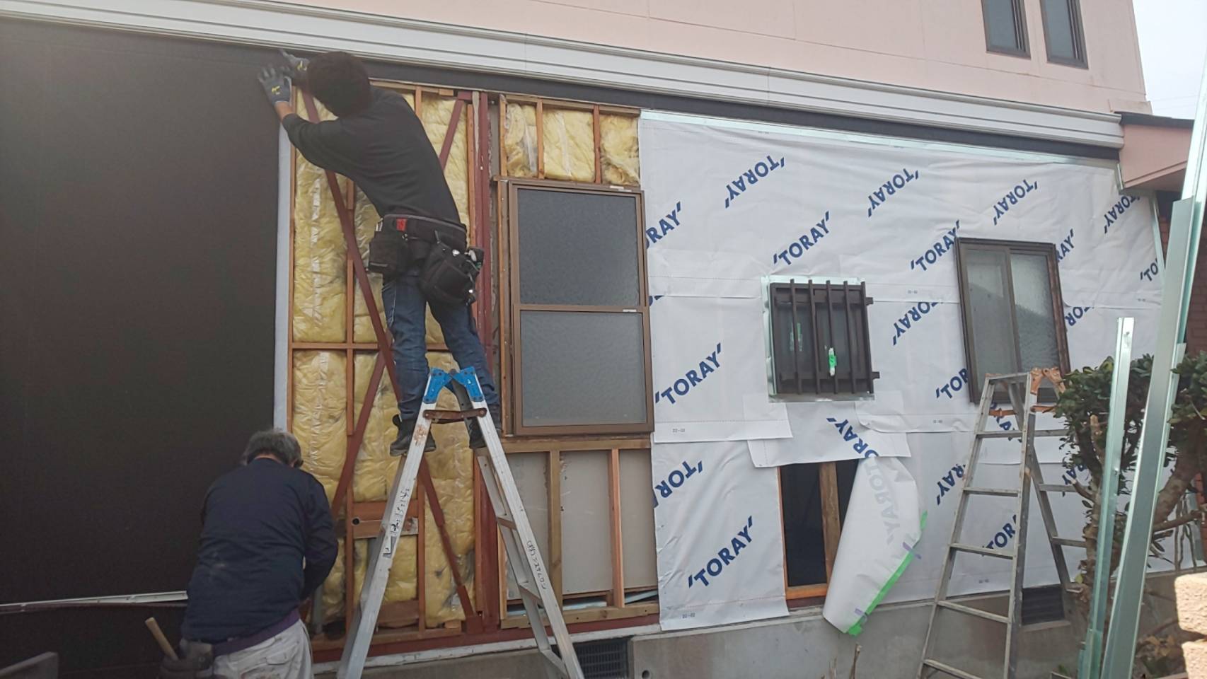 浴室の外壁も、サイディングを張って仕上げていきます。下地は、もちろんですが、シロアリ点検もしっかりサイディング張り前には、防蟻施工・もしシロアリがいたら駆除までしっかりしてから、サイディング工事を行ってお客様に安心して頂ける施工を心がけております(^^)