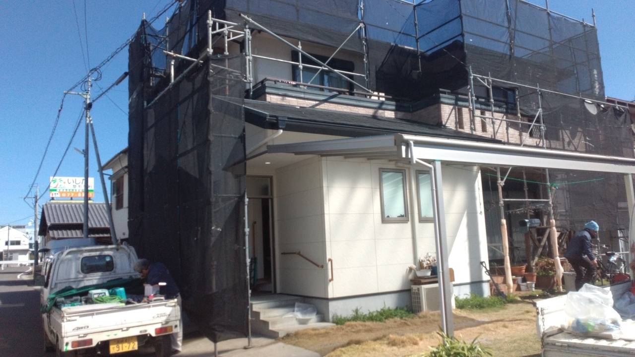 仮設足場設置完了しました。塗装前の再度点検をして屋根・壁の状態を詳細に把握します(^^)
