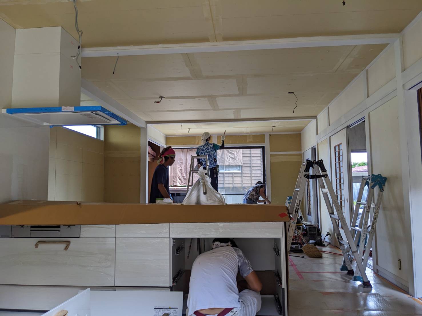 システムキッチン設置工事中です。職人さんが配管設備工事しています。出来上がりが、楽しみですね。
