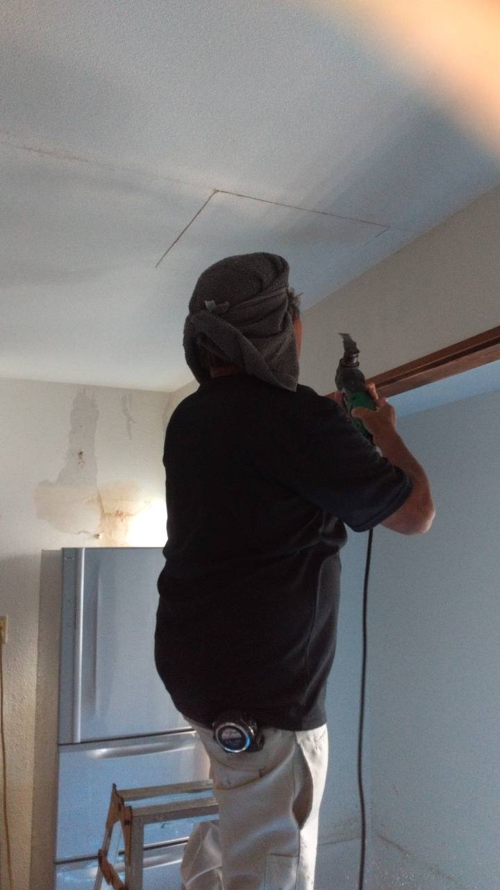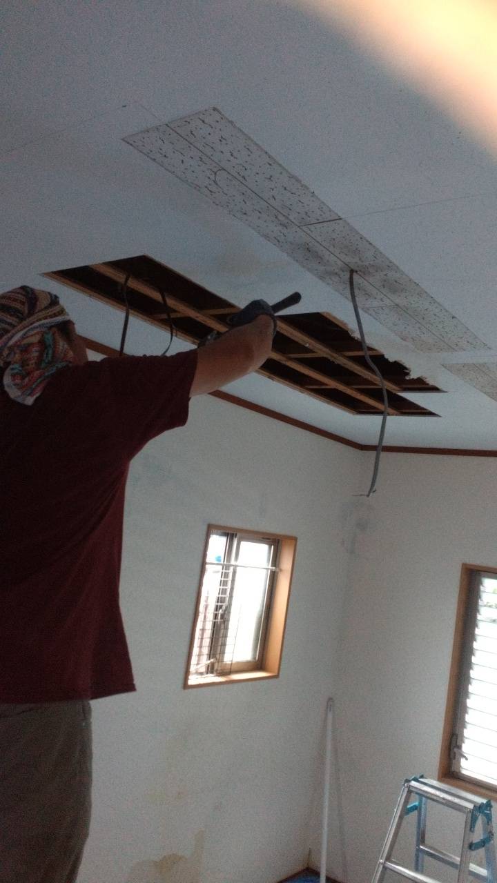 雨漏りの修繕工事中です。雨漏りの原因の部分をまず直してから天井を貼り替えいきます(^^)