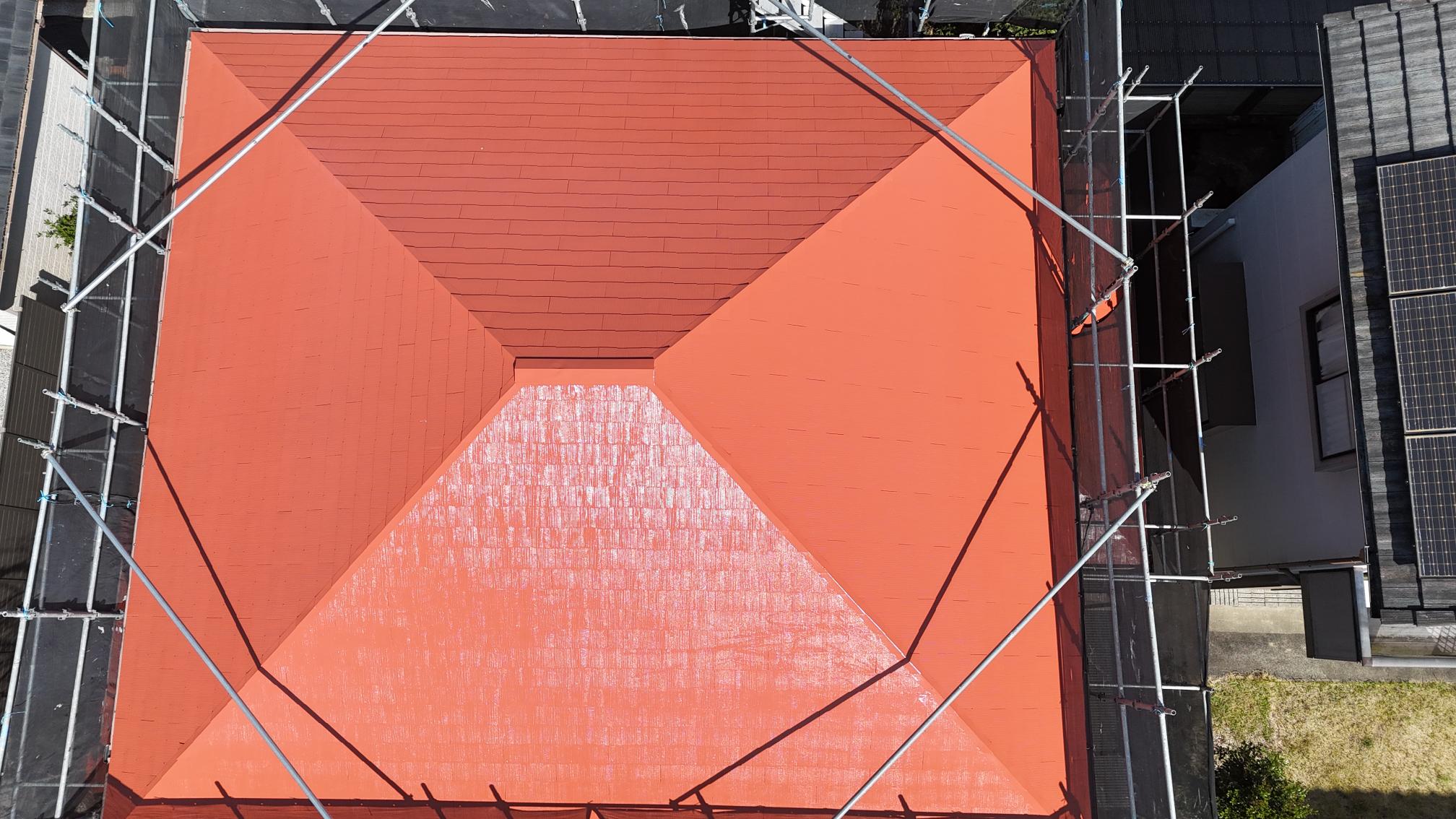 屋根塗装工事完成衣いたしました。遮熱性能塗料を使用しました。宮崎の暑い太陽からの熱を従来の塗料に比べて高く遮熱し、室内の温度上昇も以前と比べてかなり良くなっています。=省エネにも、つながります。耐用年数も長くなります。詳しくは、お気軽にお問合せ下さい。